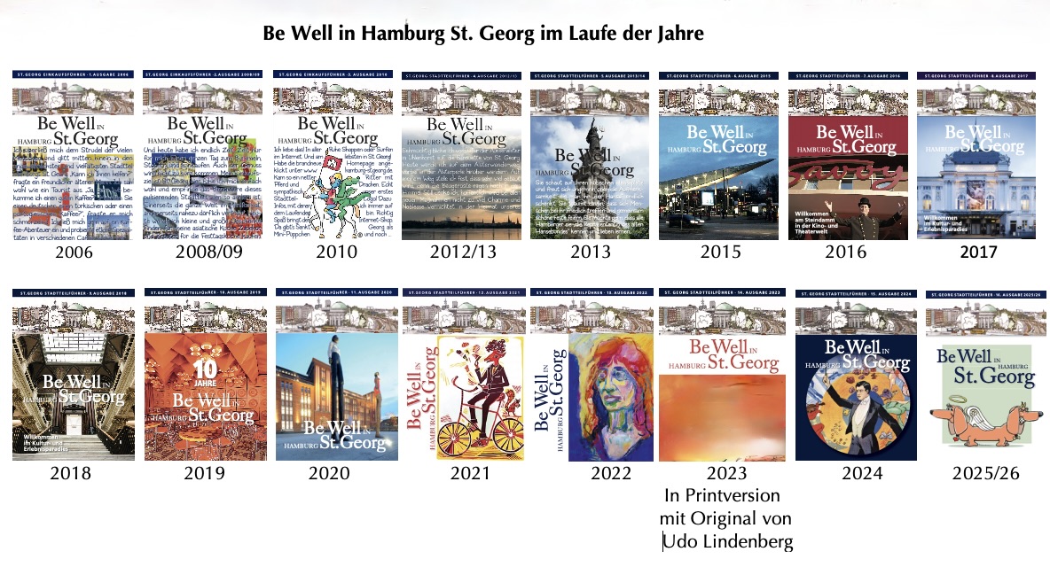 Entwicklung der Corporate Identy, des Namens mit einer stets wiederkehrenden Illustration, Gesamtgestaltung, Abwicklung, Text und Fotos inkl. Druckproduktion für den Stadtteilführer "Be Well in Hamburg St. Georg".